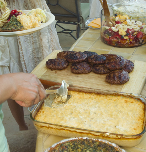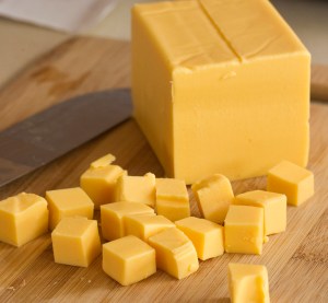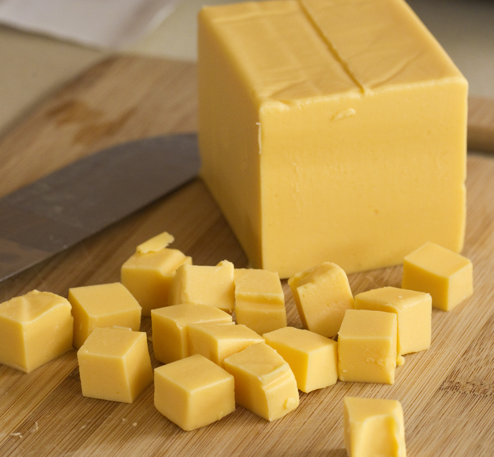 A log of Velveeta (2 cups or half a regular log), 2 lb bag of frozen hash brown potatoes, 1/2 cup of butter (or margarine), 1 can cream of mushroom (makes it vegetarian), 2 cups of sour cream, 2 tablespoons minced onion, 1 teaspoon of salt, a large mixing bow and a 9 x 13 baking pan. Oh…and an oven.