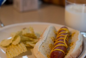 Better than at Costco. Pop a quarter pound, kosher hotdog in the microwave for about 45 seconds. Place it with care on a soft fresh potato bun. Then swirl just enough yellow mustard to give it some tang. Add a few Wavy Ranch chips and a glass of milk and you are set. A belly satisfying lunch that will make you and your taste buds very happy.